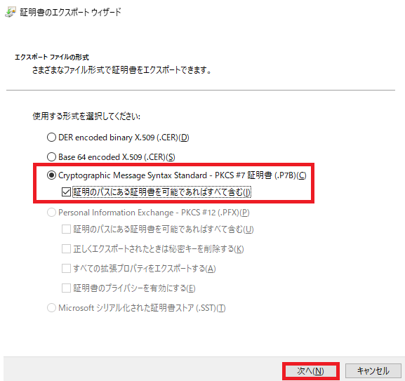 4. エクスポートファイルの形式で、「Cryptographic Message Syntax Standard - PKCS # 証明書(.P7B)(C)」を選択し、