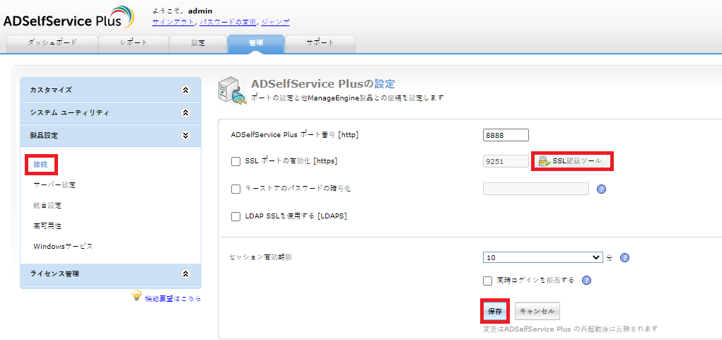 1. 管理者としてログイン後、[管理]タブ-->[製品設定]-->[接続]-->[SSL ポートの有効化[https]]にチェックを付けます。
