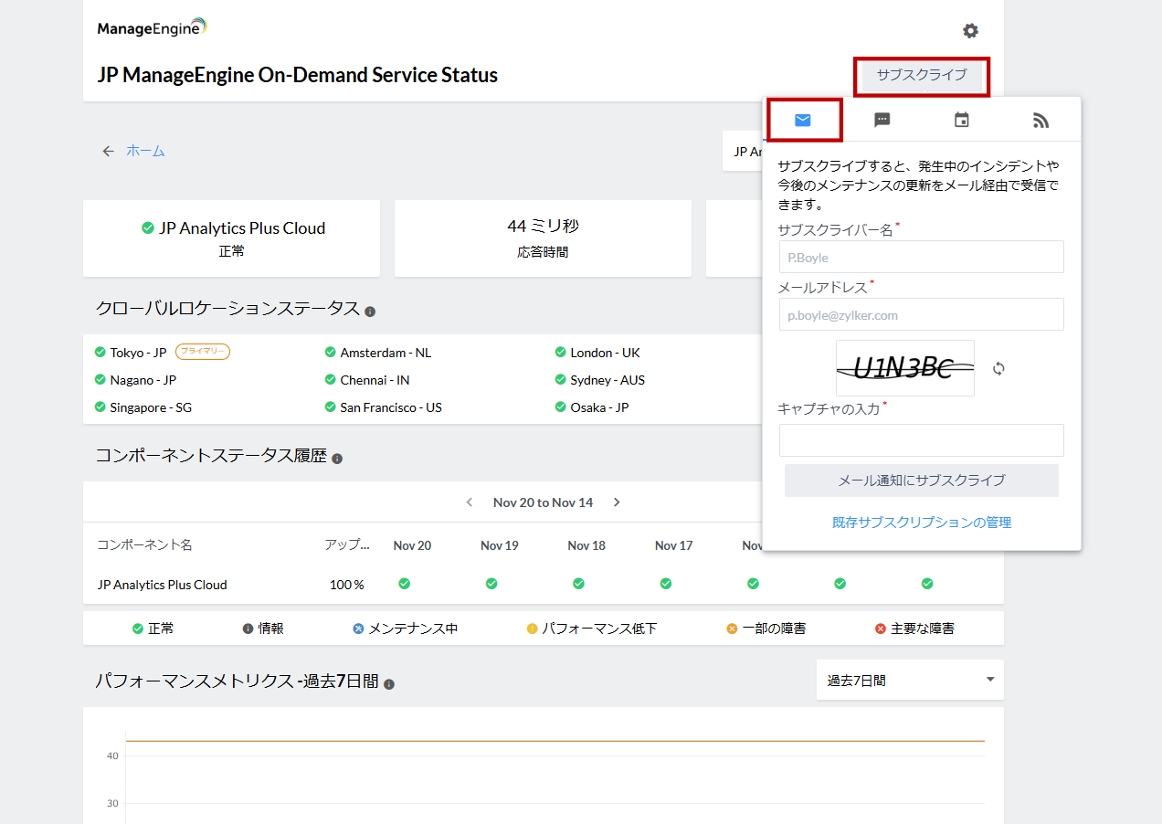 ManageEngineが提供する、日本データセンターのその他のクラウドサービスのステータスも確認できます。