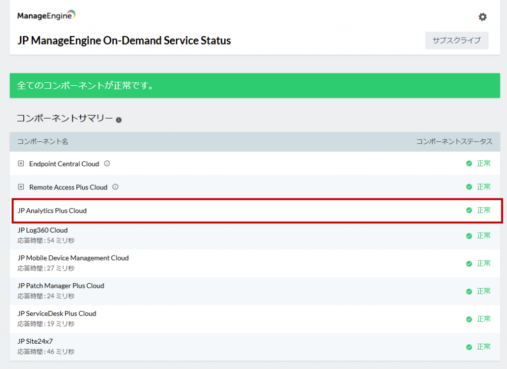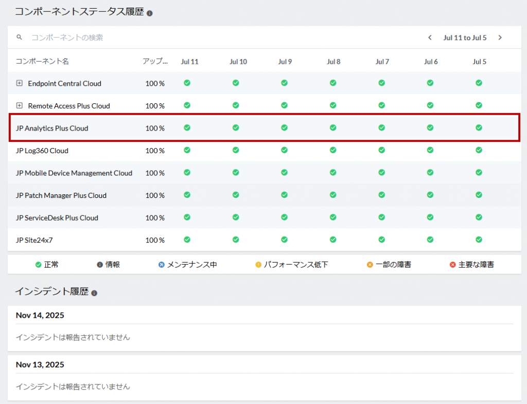https://status.manageengine.jp - 「コンポーネントサマリー」の一覧から、「JP Analytics Plus Cloud」をクリックします。