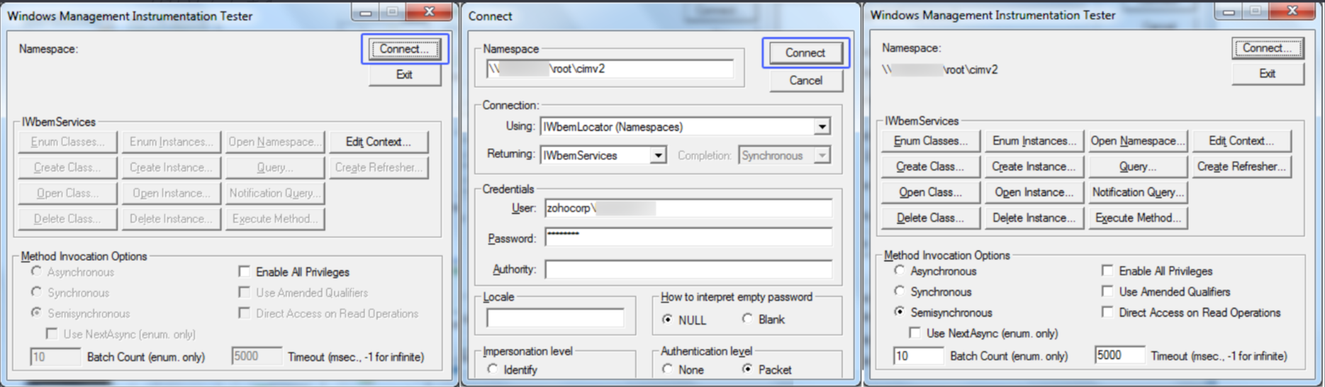 Windows ManagementInstrumentationTesterツールが開きますので、[接続]ボタンをクリックします。 - 最初のテキストボックス (\\ root \ default)に、 \\ ホスト名 \ root\cimv2を入力します。