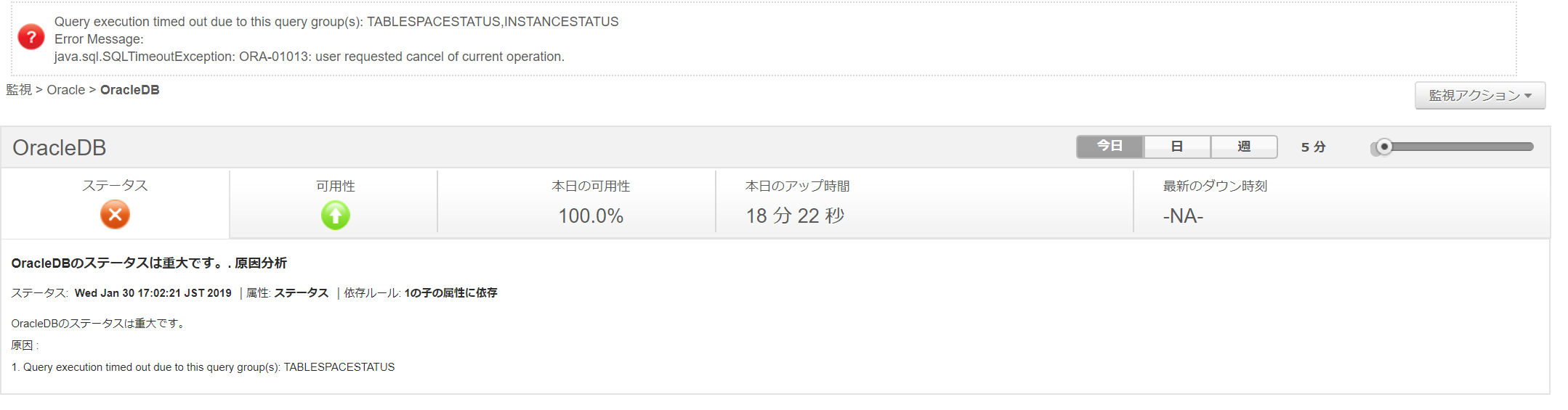 データベース監視で以下の画面のようなタイムアウトのエラーが表示される