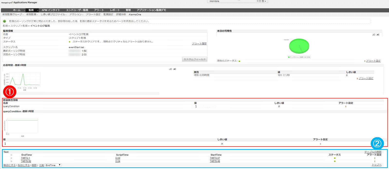 スクリプト実行の可用性、実行するまでに要した応答時間、及び実行で出力した結果をテーブルデータやグラフにして可視化/監視するものです。