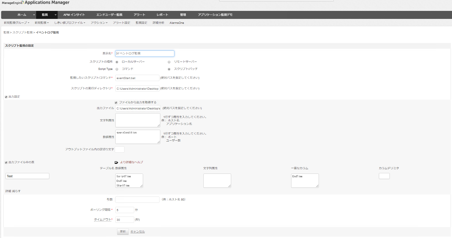 スクリプト監視は、Applications Managerインストールサーバー内で「.bat」、「.sh」、「.java」等のファイルを実行し、