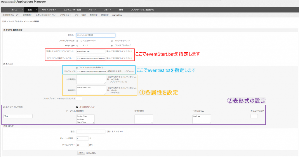 - 「出力ファイル中の表」では、Testというテーブルをeventlist.txtの中で定義し(表形式にて結果が出力される場合参照)ある3つの値を数値属性で取得。(②表形式の設定)