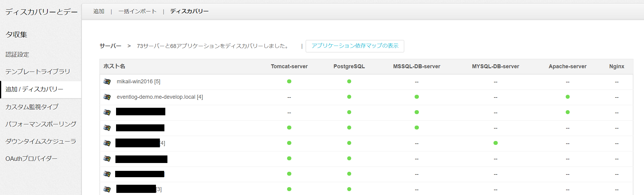 7. ディスカバリー後の画面で[アプリケーション依存マップの表示]をクリック