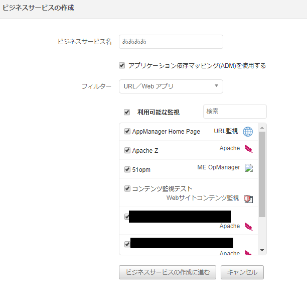 8. [アプリケーション依存マッピングを使用する]および[利用可能な監視]にある該当の監視にチェックを入れ、
