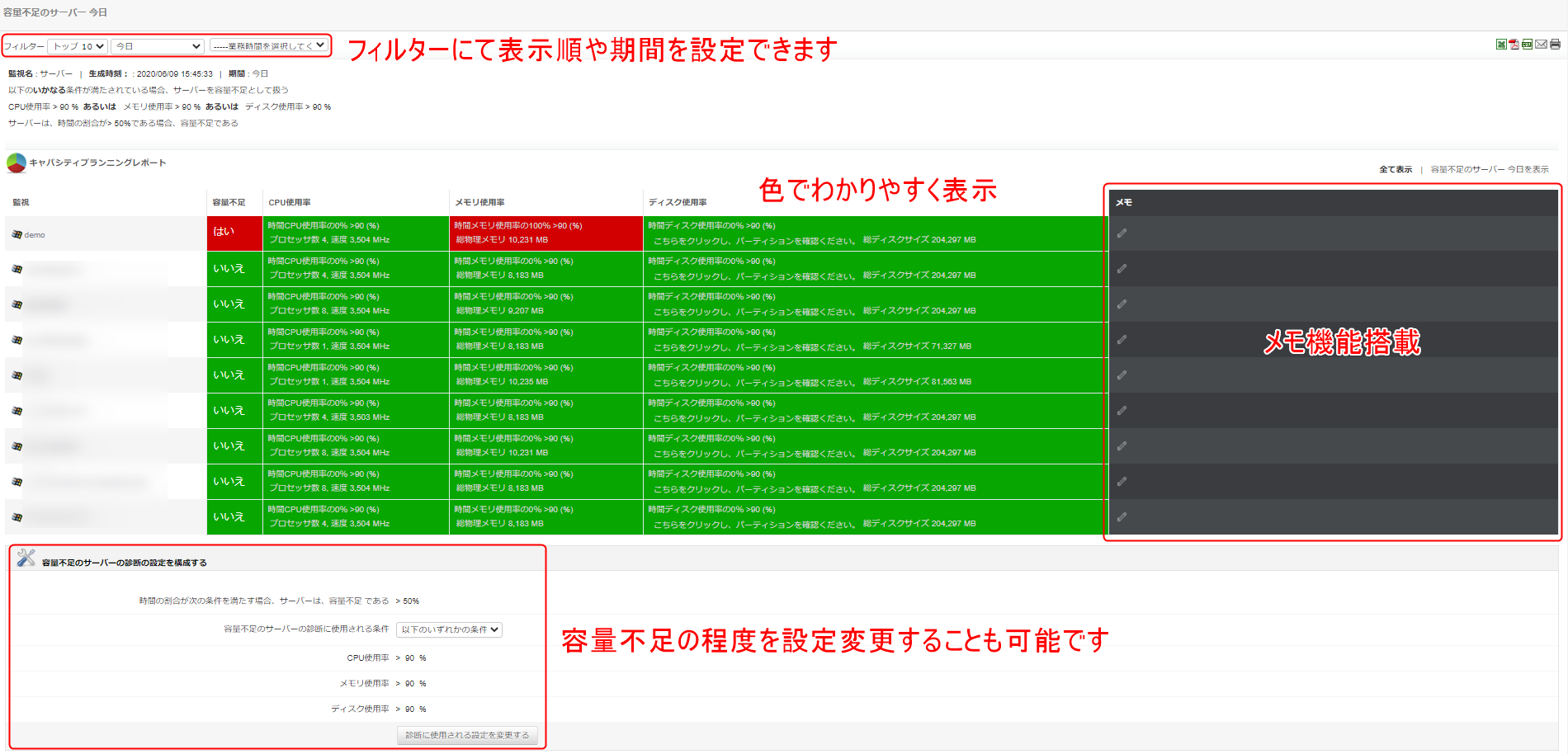 設定した容量(使用率)より多くのリソースを使用しているサーバーを把握することができます。