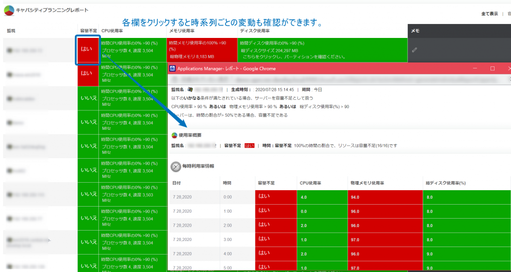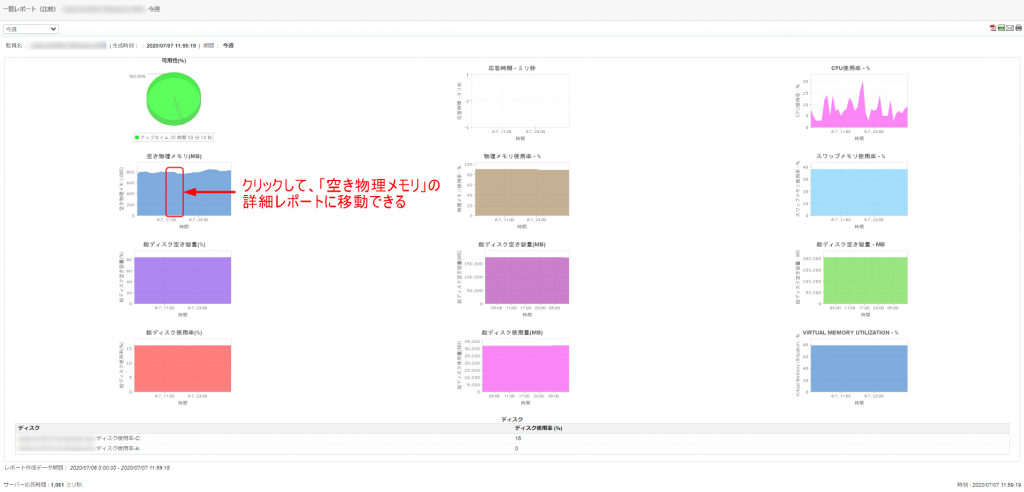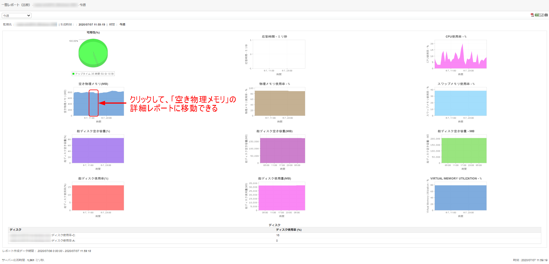 レポート内各監視項目のグラフをクリックすると、監視のすべての属性を単一のビューで見ることができます。