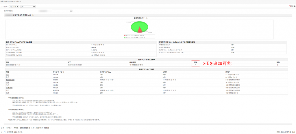 また、ダウンした際には発生理由に関するメモを追加できます。