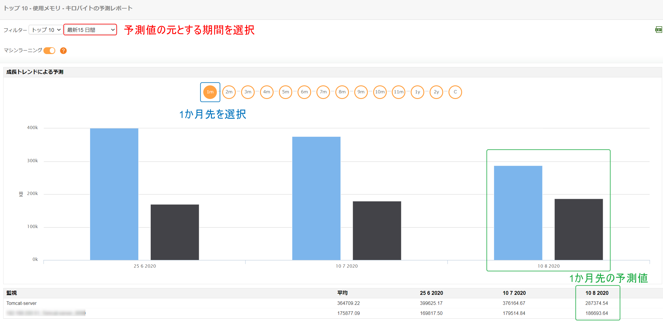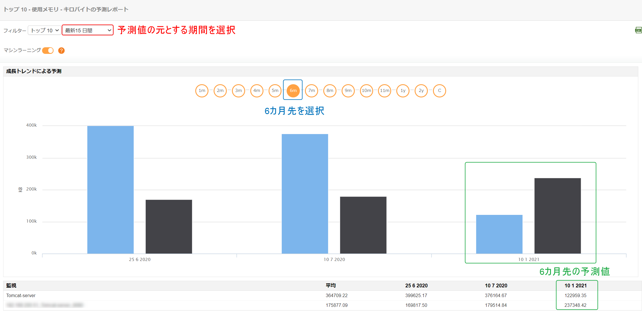 上記のレポートでは、Tomcatサーバーの使用メモリに関して最新15日間の値から1か月先/6か月先の値を予測しました。
