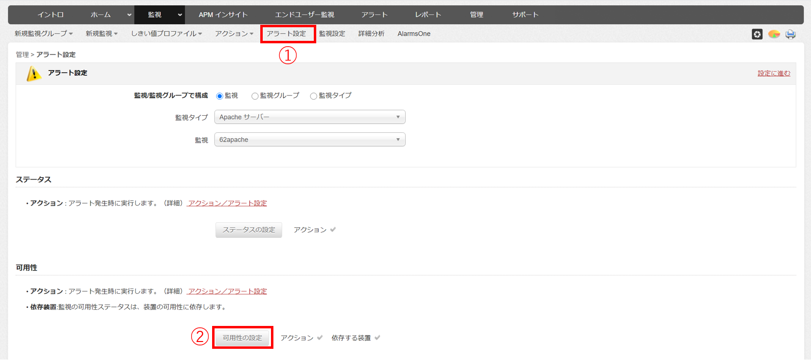 1.[アラート設定]をクリックし、アクションを関連付ける監視をドロップダウンリストから選択します。