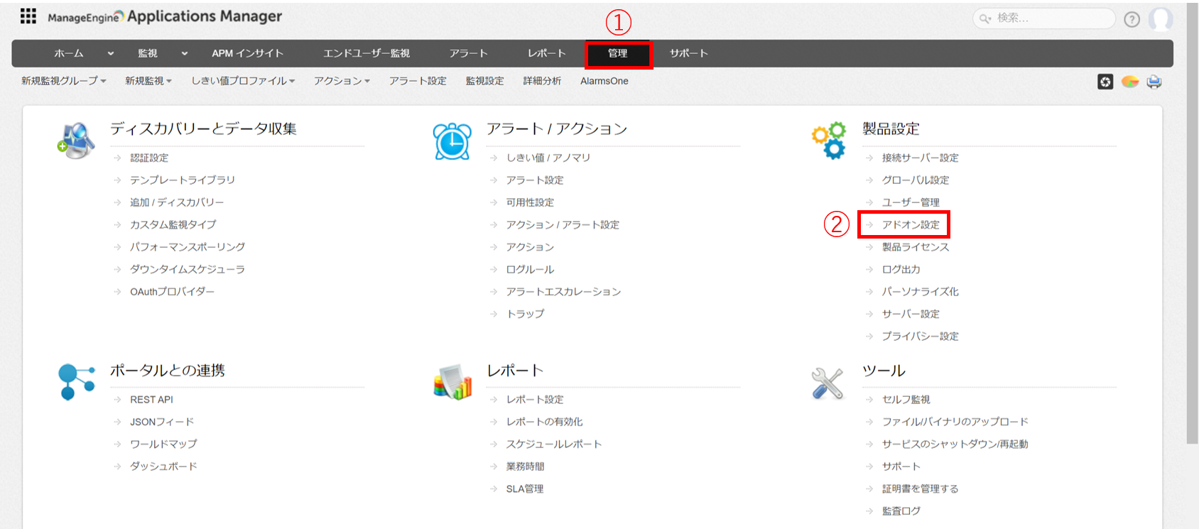 1.Applications Manager画面で、[管理] → [アドオン設定] の順にクリックします。