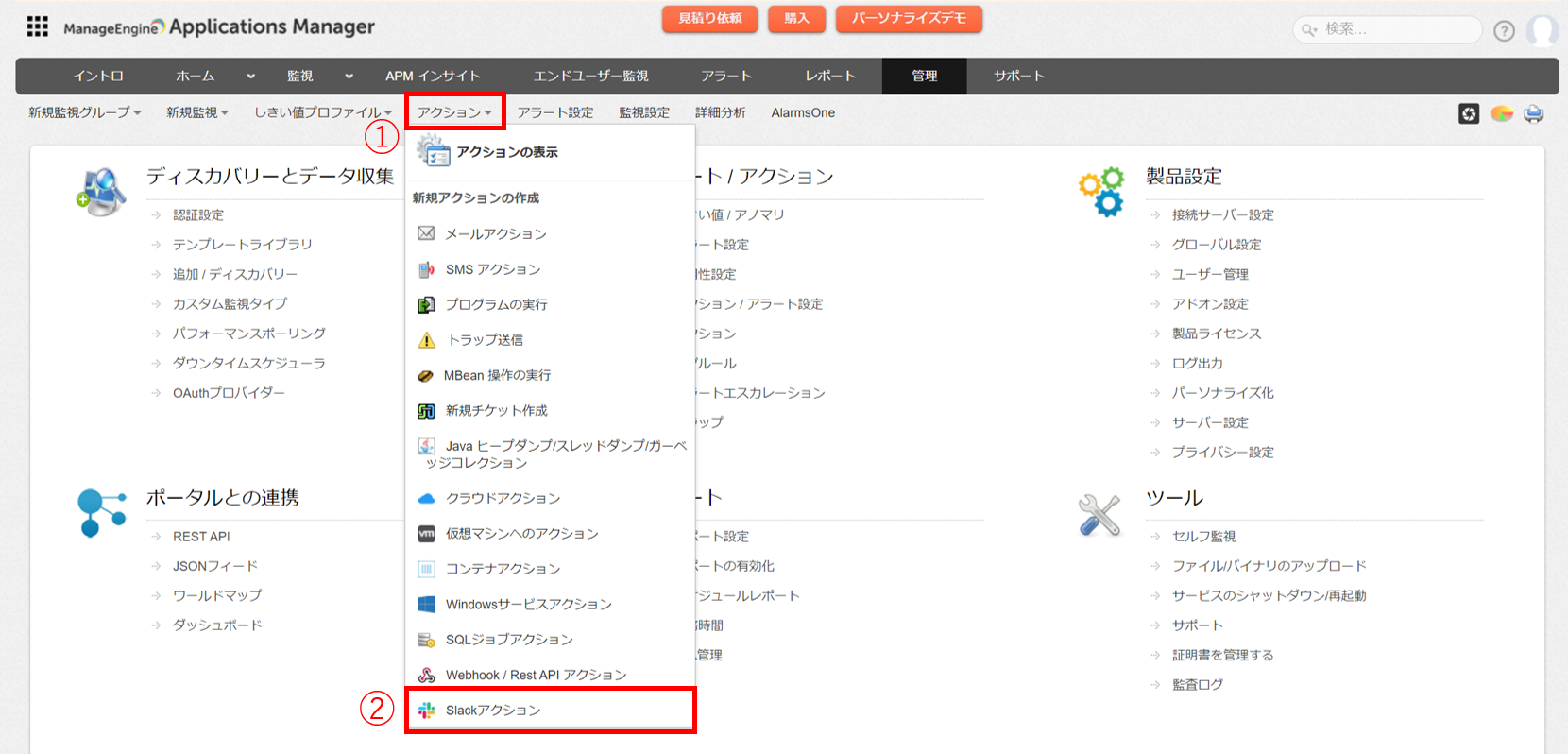 1.Applications Manager画面で、[アクション] → [Slackアクション]の順にクリックします。