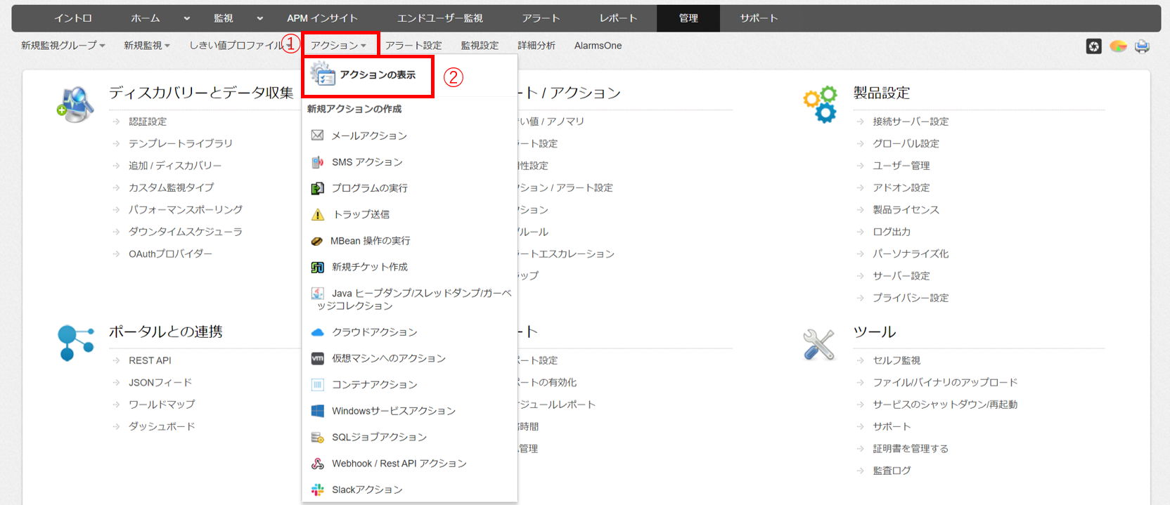 次の手順でApplications Managerの通知に必要なアクションを作成します。