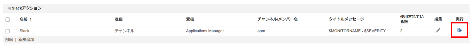 2.Slackアクション欄の[実行アイコン]をクリックします。