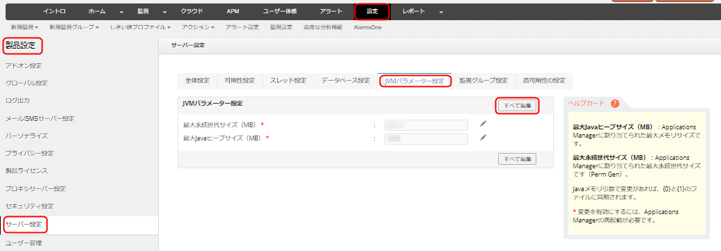 - [設定]タブ → [製品設定]配下の[サーバー設定]→ [JVMパラメーター設定]タブに遷移