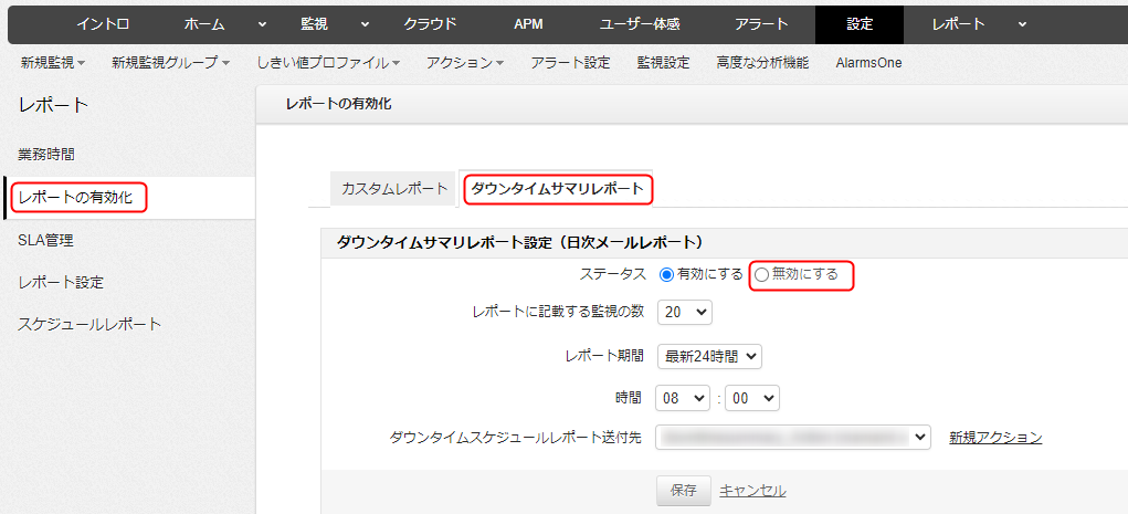 [設定]→レポート配下の[レポートの有効化]→[ダウンタイムサマリーレポート]→[無効にする]→[保存]