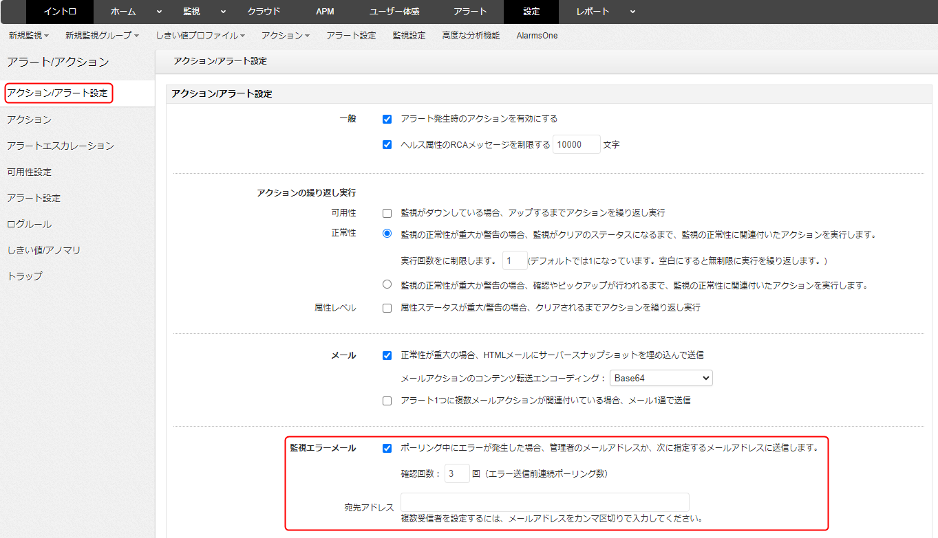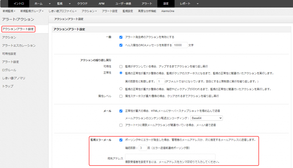 監視エラーメールを無効にしたい