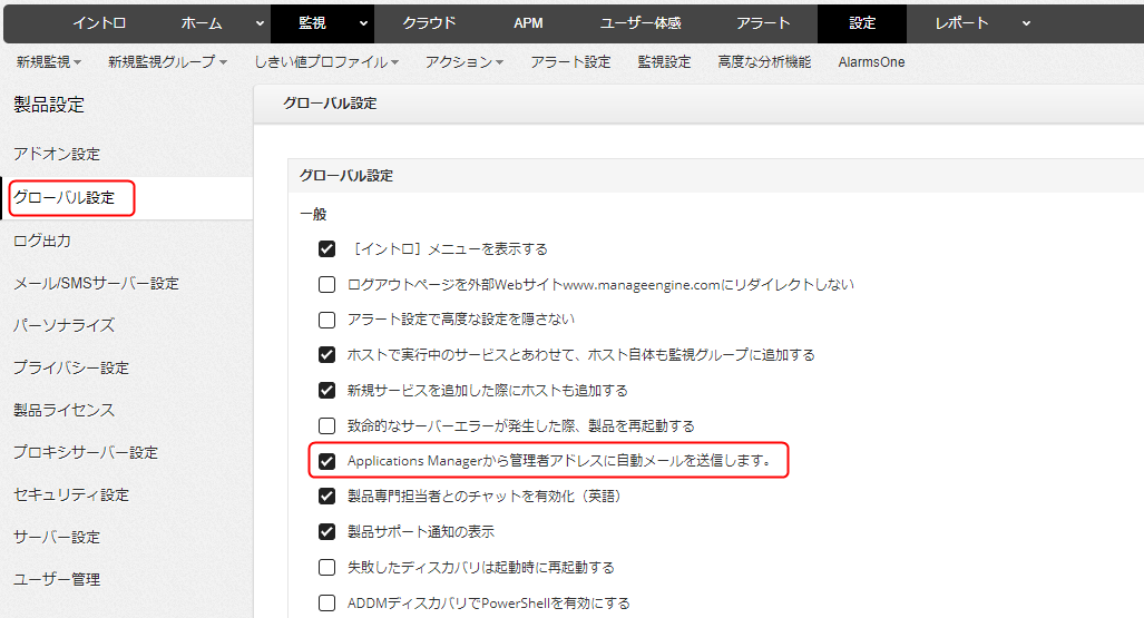 [設定]→製品設定配下の[グローバル設定]→「Applications Managerから管理者ユーザーのEメールIDに自動メールを送信する。」のチェックを外し、[保存]