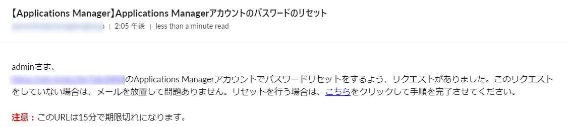 ※リセットリンクは15分間のみ有効です。その時間内にApplications Managerを再起動すると、リセットリンクは無効になります。 - リンクをクリックして、パスワードをリセットします。パスワードを入力し、[パスワードの更新]ボタンをクリックします。