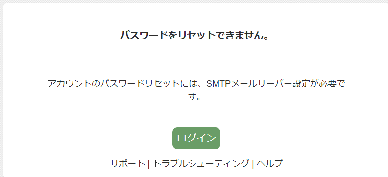 設定されていない場合、「アカウントのパスワードリセットには、SMTPメールサーバー設定が必要です。」とエラーが表示されます。