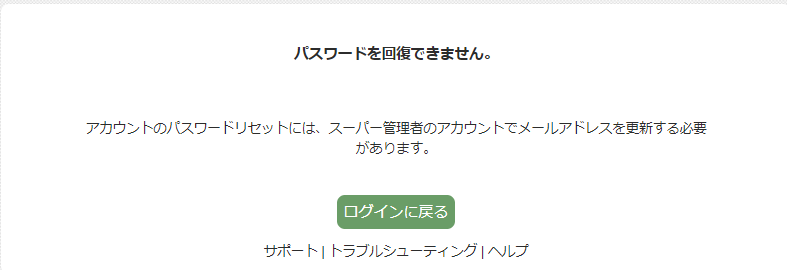 設定されていない場合、「アカウントのパスワードリセットには、スーパー管理者のアカウントでメールアドレスを更新する必要があります。」とエラーが表示されます。