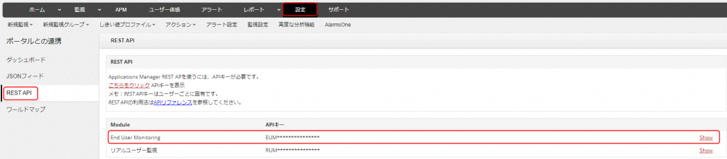 ログイン時に求められるEUM APIキーは、Applications ManagerUI[設定]→[REST API]→[End User Monitoring]からご確認ください。