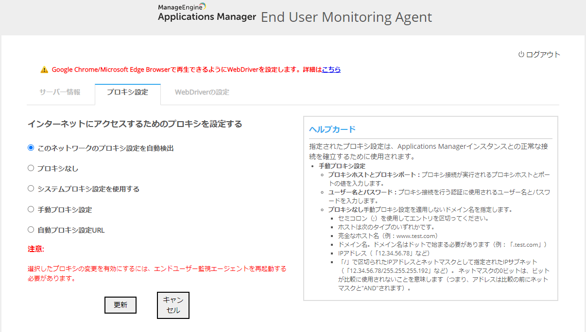 エンドユーザー監視エージェント(以下、EUMエージェント)とApplications Managerを接続するためにプロキシ設定を行う場合は以下の手順を実施してください。