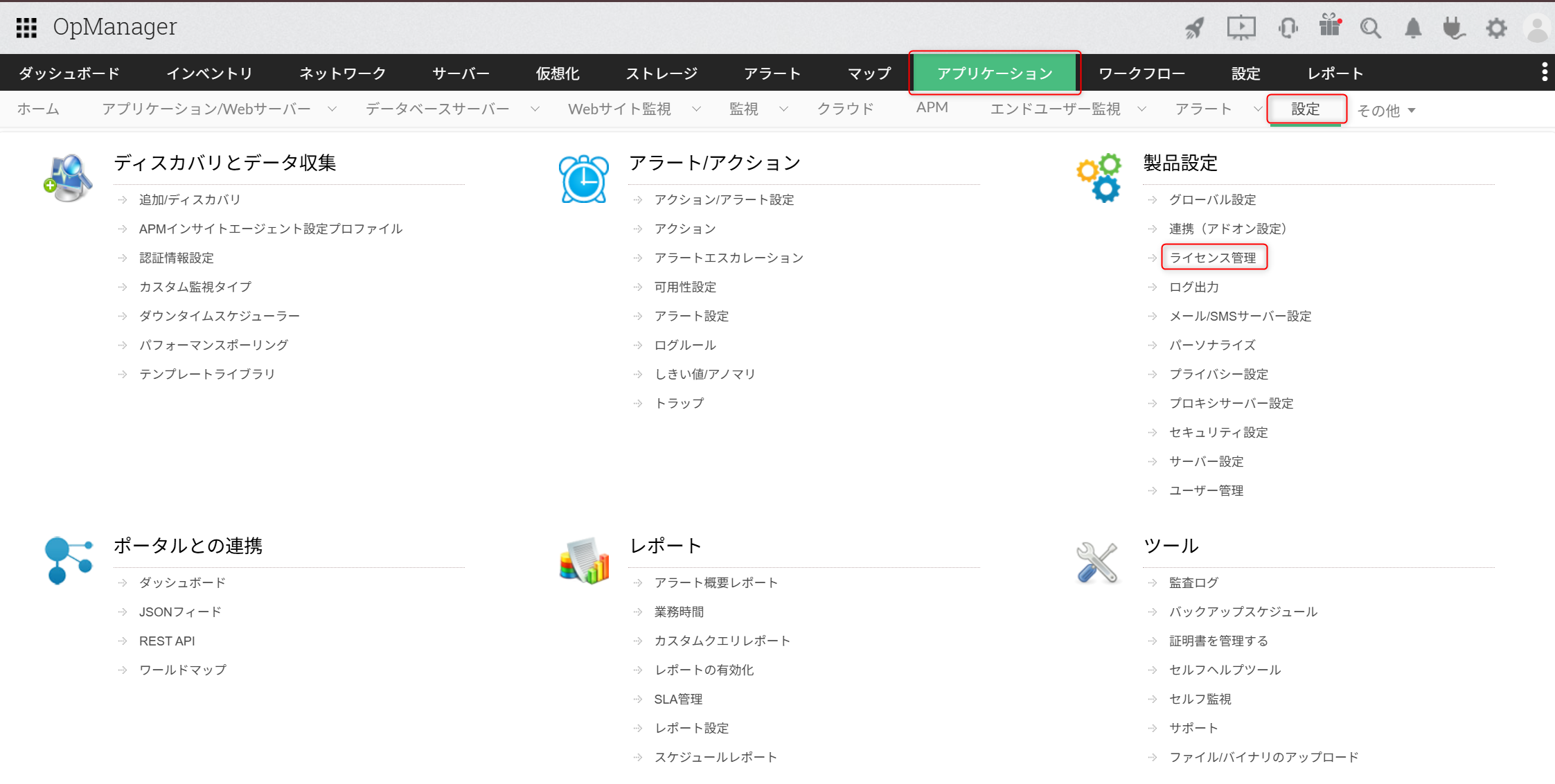 ※ManageEngine Communityお問い合わせ方法 - [アプリケーション]タブ→[設定]タブ →製品設定配下の[ライセンス管理(製品ライセンス)]をクリック