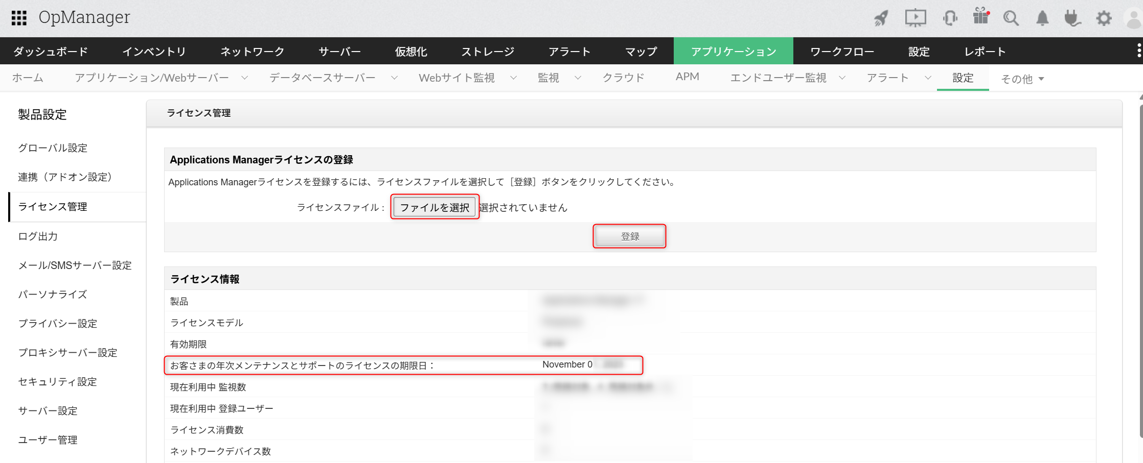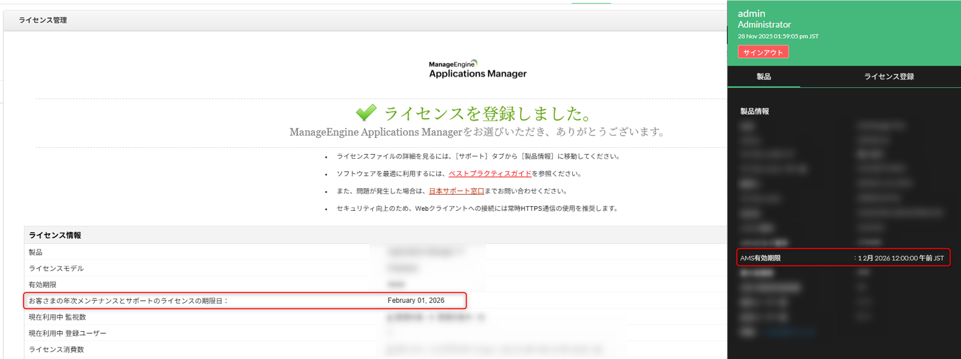 AMSライセンス適用後、[アプリケーション]タブ→[設定]→製品設定配下の[ライセンス管理(製品ライセンス)]から「お客さまの年次メンテナンスとサポートのライセンスの期限日」の日付けが更新されない。