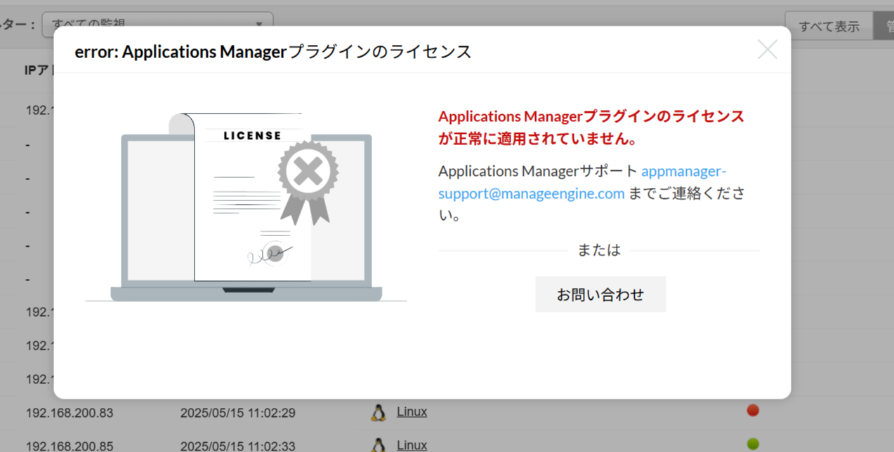 OpManagerにAMSライセンスを適用後、以下のエラー画面が表示される。
