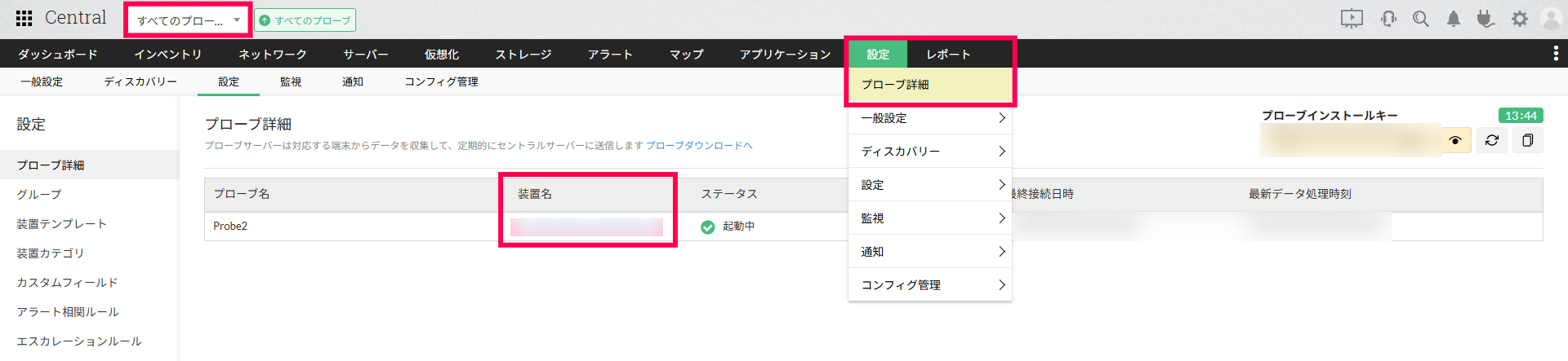 セントラルサーバーのOpManagerUIにある[設定]タブ→[プローブ詳細]に移動し、各プローブサーバーの[監視名]カラムのURLをクリックします。