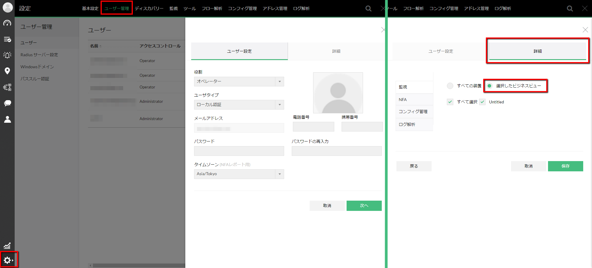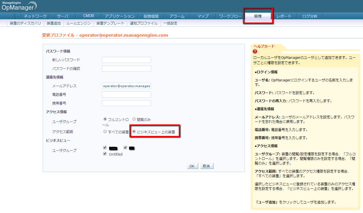 [詳細]タブの[監視](アクセス可能な範囲の設定)にて、「ビジネスビュー上の装置」が設定されているユーザーです。