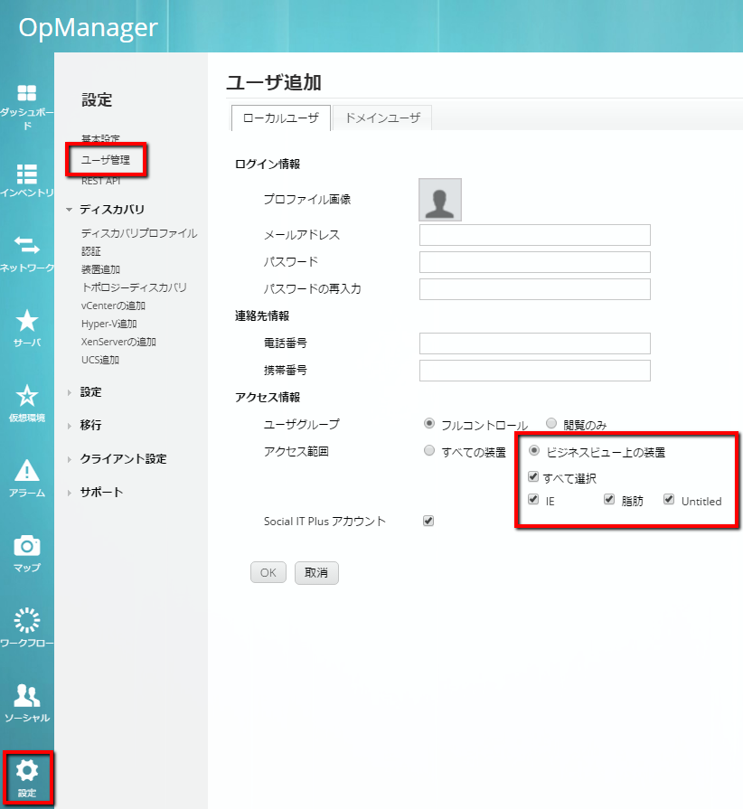 - 原因2:OpManagerのユーザー設定で「ビジネスビュー上の装置」のみ表示可能なユーザーはAPMプラグインに表示されません。