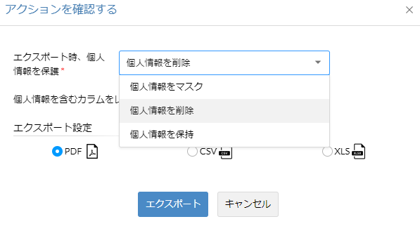 個人を特定可能な情報が含まれるカラムについては、伏せ字にするか、そのまま表示させるか、その都度確認するかをエクスポート設定から指定可能です。