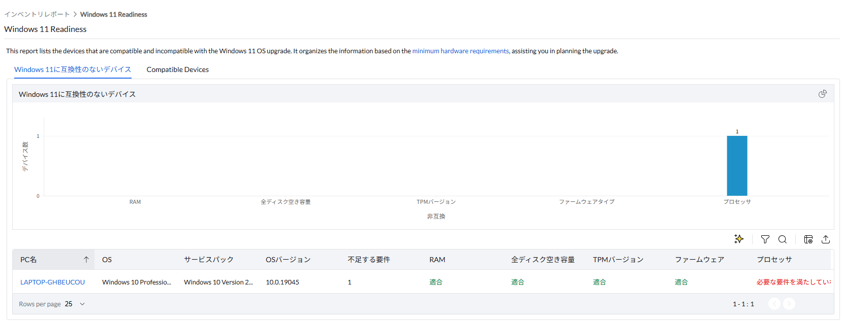(または「ホーム」タブ →「Zia分析」→「Windows 11 Compatible devices」の「Windows 11 readiness report」をクリックします。) - 「Windows 11に互換性のないデバイス」をクリックすると、Windows 11の要件を満たさないコンピューターが、「compatible devices」(互換性のあるデバイス)をクリックすると、Windows 11の要件を満たすコンピューターが表示されます。