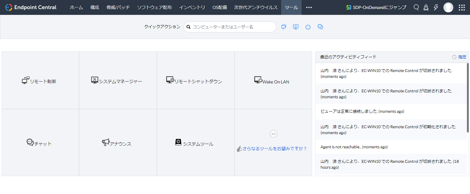 Endpoint Central Cloudには、管理対象コンピューターを遠隔操作するリモート制御機能があり、トラブルシューティングやメンテナンス、管理対象を使用中のユーザーとの連絡や告知等の目的で使用できます。リモート制御機能を使用するには、コンソール画面の「ツール」タブを開きます。
