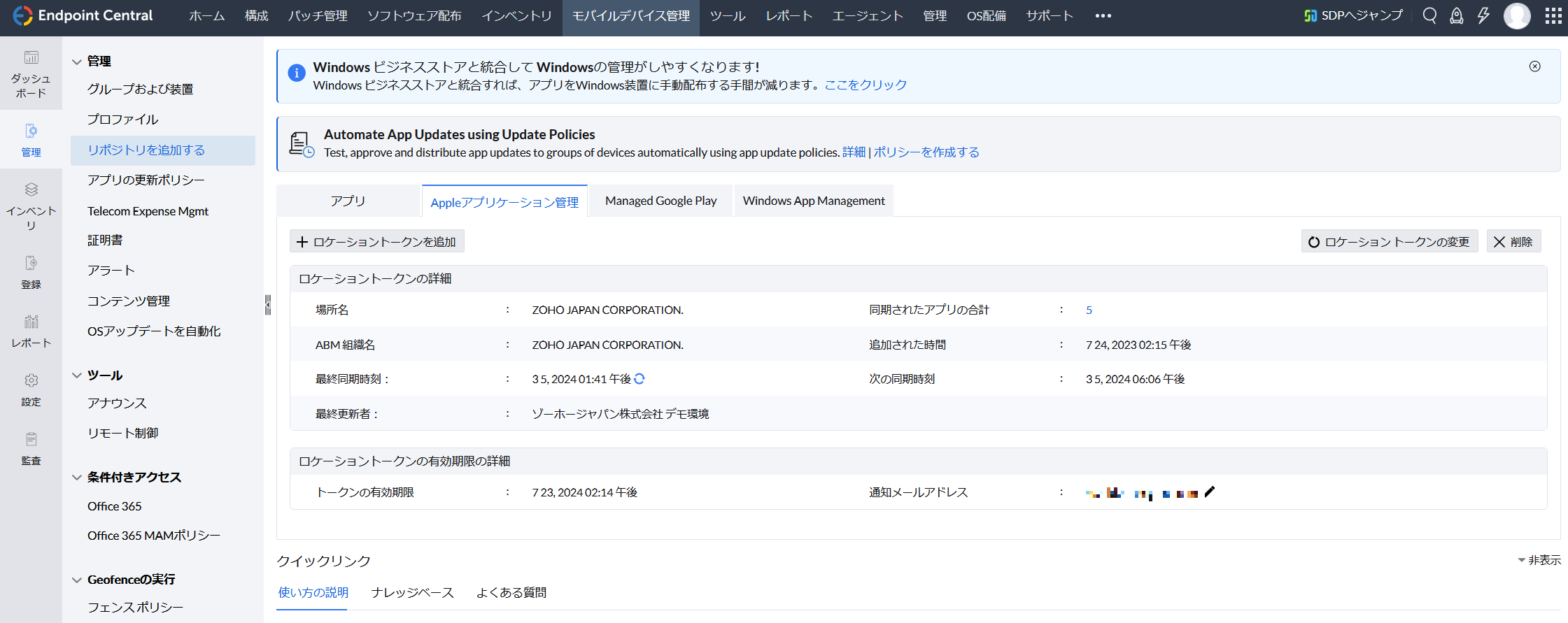 - サーバートークンのアップロードが完了すると、トークンの詳細がコンソール上に表示されるようになり、ABMで購入されたアプリケーションがリポジトリに自動的に追加されます。
