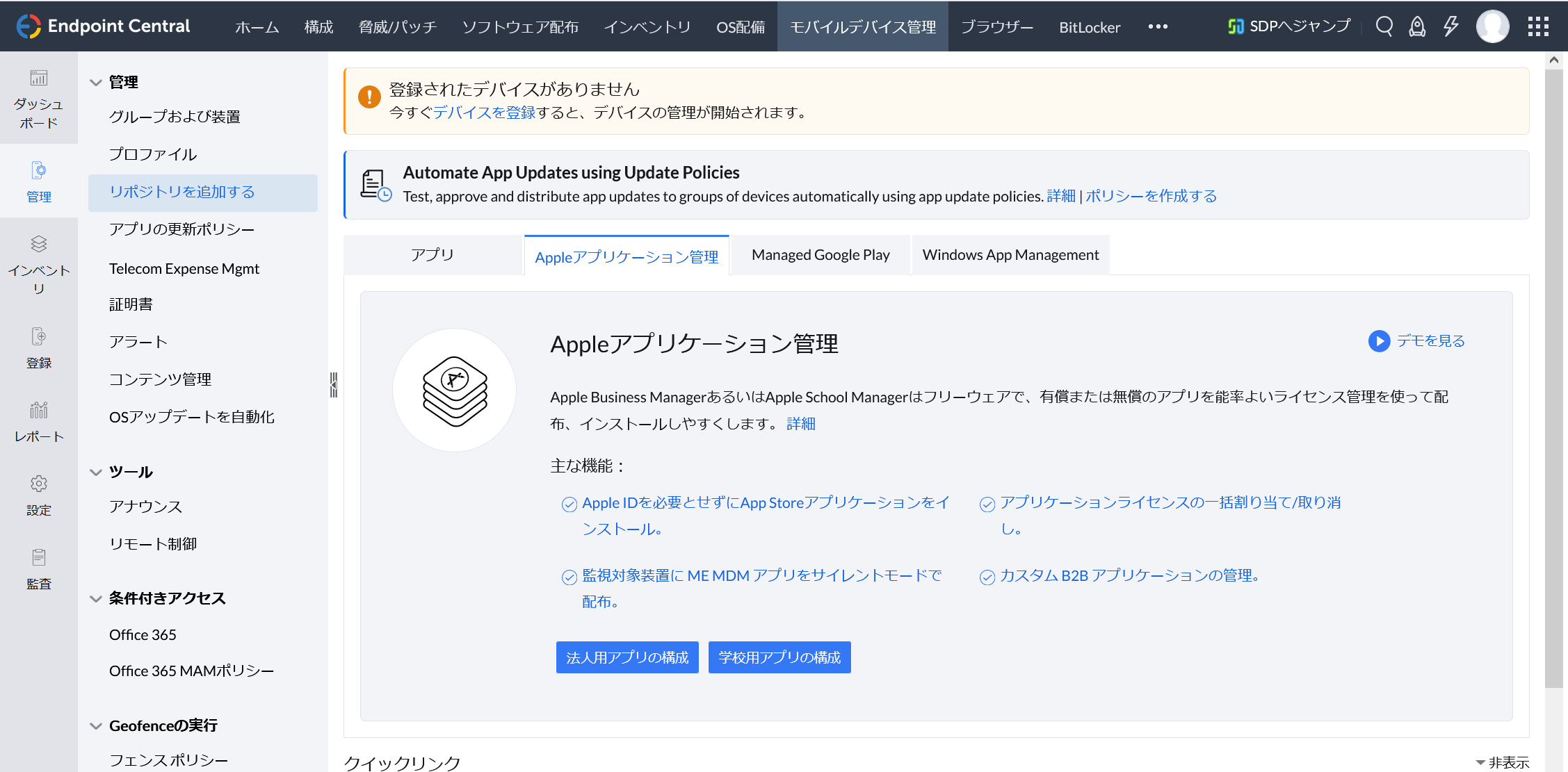 - Endpoint Central Cloudコンソールの[モバイルデバイス管理]タブ →[管理]→[リポジトリを追加する]→[Appleアプリケーション管理]を開きます。