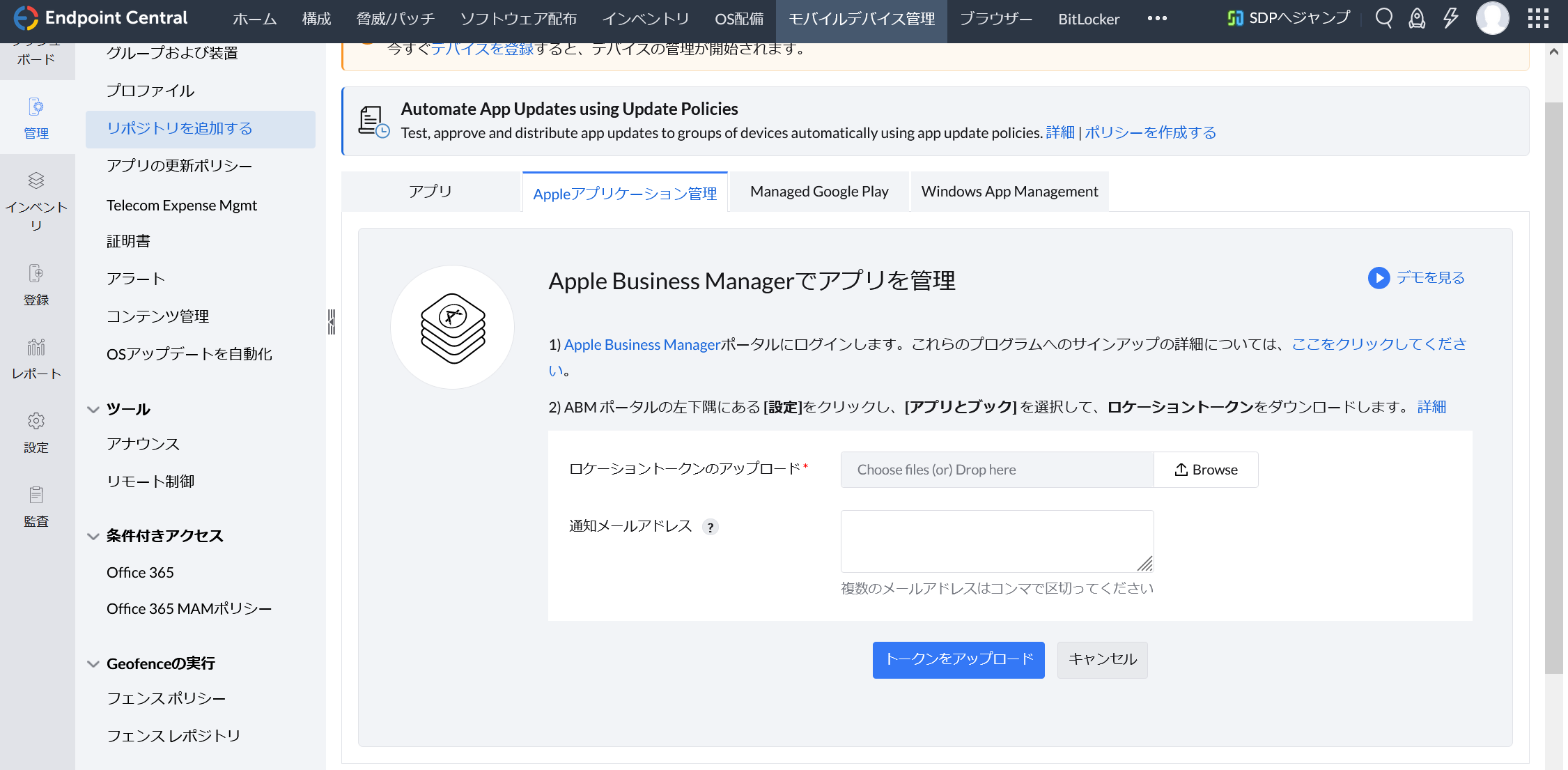 ABMのサーバートークンをEndpoint Central Cloudにアップロードすることで、ABMサーバーとEndpoint Central Cloudサーバーを同期します。