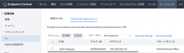 エージェントがインストールされたコンピューターについて、意図しないコンピューターが管理対象に紛れないよう、管理対象に追加するかどうかを管理者が承認します。デフォルトではエージェント承認設定が有効なため、エージェントをインストールしただけでは管理対象に追加されません。エージェントのインストール後、承認することで管理対象に追加されます。