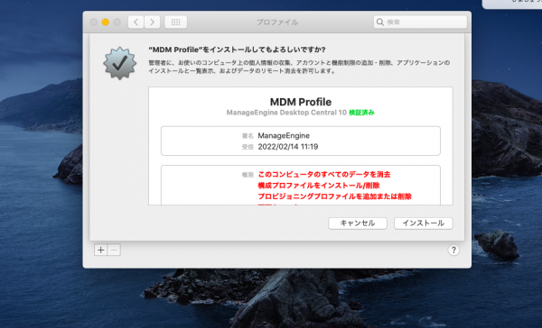 「Enroll Now」をクリックするとプロファイルインストール画面が表示されるため、「インストール」をクリックします。