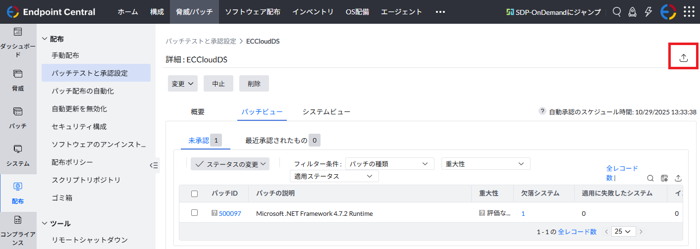 - 「パッチ管理」タブ(または「脅威/パッチ」タブ)→「配布」→「パッチテストと承認設定」を開きます。