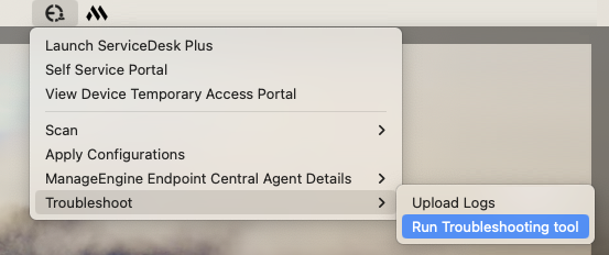 - エージェントがインストールされているWindowsコンピューターのタスクトレイをクリックし、以下のスクリーンショットのEndpoint Centralエージェントのトレイアイコンを右クリックします。