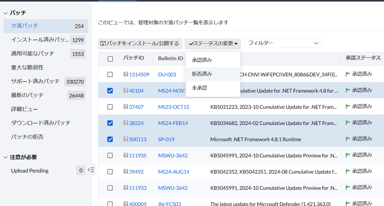今後追加される新規パッチは「未承認」というステータスになりますが、既存のパッチはその時点のステータスが維持されます。 - 未承認に変更