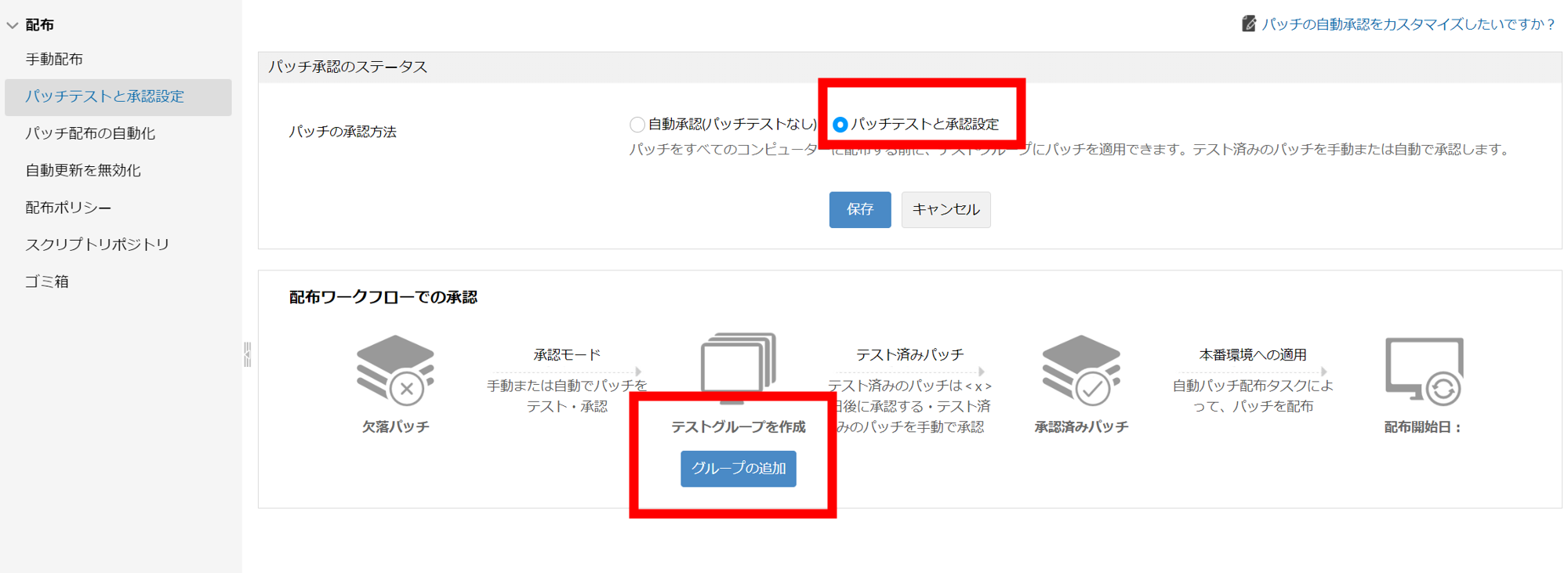 - [パッチ管理]タブを開き、左側メニューにおいて[配布] → [パッチテストと承認設定] をクリックします。
