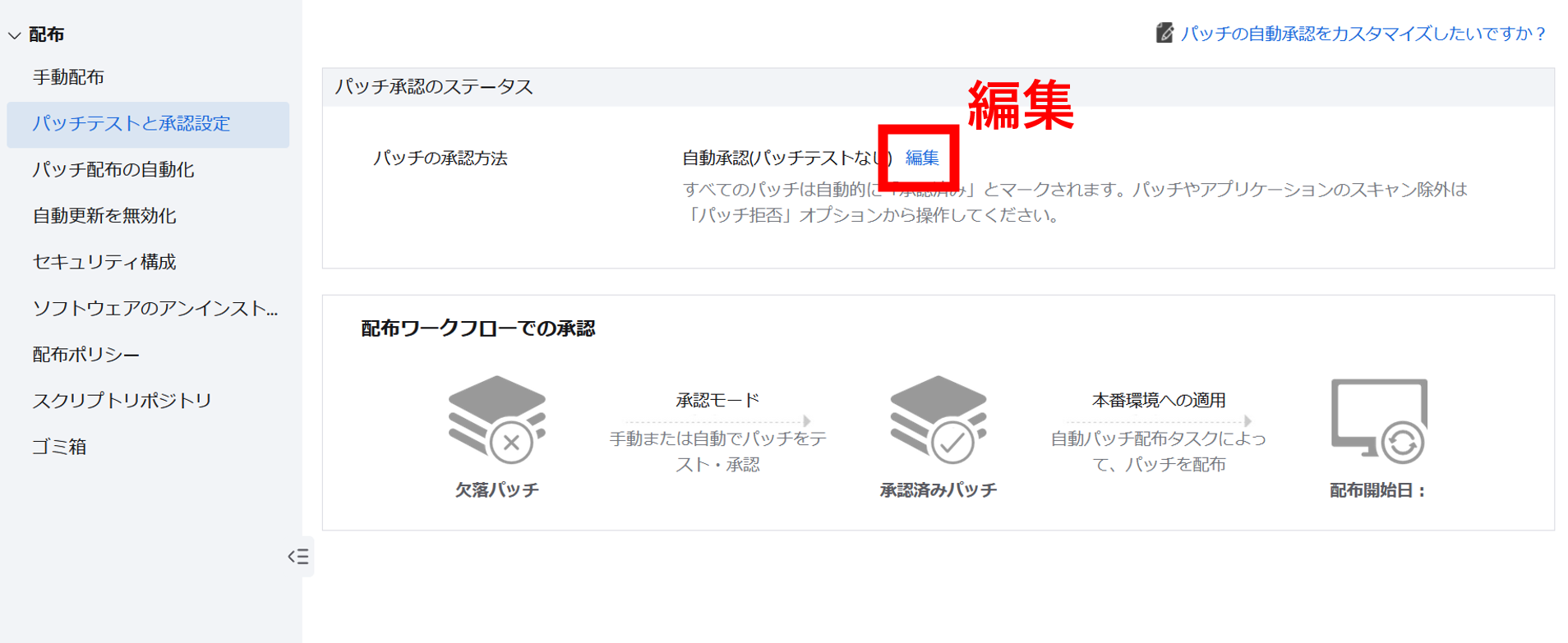 - 「パッチの承認方法」の項目内にある「編集」をクリックします。