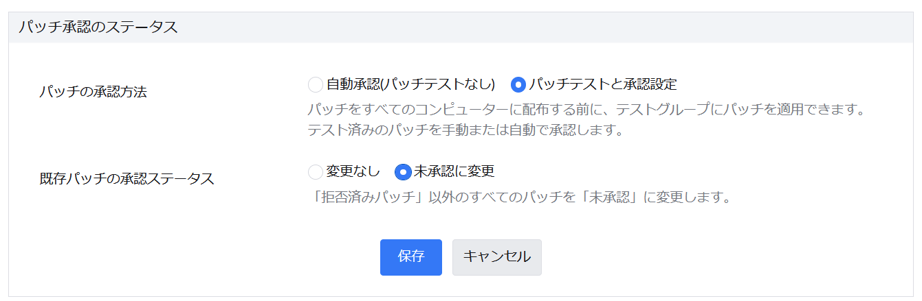 - 「既存パッチの承認ステータス」にて以下2つのいずれかを選択し、「保存」をクリックします。