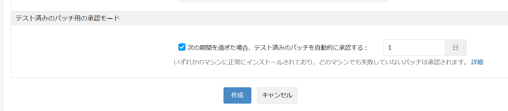 - 「テスト済みのパッチ用の承認モード」にて、「次の期間を過ぎた場合、テスト済みのパッチを自動的に承認する」の項目を有効化、または無効化します。